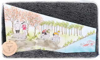 Toen ik de vorige serie kaartjes maakte, kreeg ik ook het idee om de drie takken van sport te combineren en er een triatlon kaart van te maken. Natuurlijk wel even een apart formaatje natuurlijk, een schets hoe ik het wou hebben en vervolgens ging ik aan de slag met mijn inkt, sponsjes, potloden en drie stempelsets namelijk Do the impossible, Snow front en My meadow. Ik ben heel tevreden met het resultaat. Wanneer je het opstuurt, weet de ontvanger niet wat hij krijgt, want die ziet in eerste instantie alleen de zwemmer. Dus een verrassend effect.